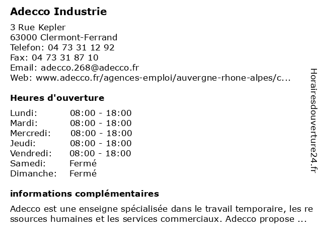 1 Adecco Medical (Distance: 0,00 km) 3 Rue Kepler, 63000 Clermont-Ferrand adecco, agences, cdd, cdi, clermont, emploi, emploi intérim, ferrand, medical, services 2 Adecco BTP (Distance: 0,04 km) 3 Rue Kepler, 63000 Clermont-Ferrand adecco, agences, btp, cdd, cdi, emploi, emploi intérim, services 3 Restaurant L'Industrie (Distance: 2,17 km) 74 Rue Henri Barbusse, 63000 Clermont-Ferrand bar, café, industrie, l'industrie, restaurant, restaurants 4 Agence d'intérim Manpower Clermont Industrie Recrutement (Distance: 2,33 km) 6 Avenue Michel Ange, 63000 Clermont-Ferrand agence de recrutement, agence intérim, agence pour l'emploi, cabinet de recrutement, cdi, intérim, recrutement 5 Agence d'Intérim Manpower Clermont Industrie (Distance: 2,34 km) 6 Avenue Michel Ange, 63000 Clermont-Ferrand agence, agence de recrutement, agence intérim, agence pour l'emploi, cabinet de recrutement, cdi, clermont, d'intérim, industrie, intérim, manpower, recrutement 6 Adecco (Distance: 5,52 km) - Zone industrielle de Ladoux, 63118 Cebazat adecco, agences, cdd, cdi, emploi, emploi intérim, généraliste, services  |