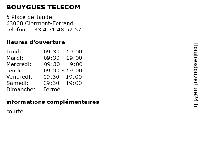 1 BOUYGUES TELECOM (Distance: 0,12 km) 24 Rue du 11 Novembre, 63000 Clermont-Ferrand bouygues, fai, fournisseur d'accès internet, telecom, téléphonie mobile 2 BOUYGUES TELECOM (Distance: 3,07 km) Boulevard Saint-Jean, 63000 Clermont-Ferrand bouygues, clef, telecom 3 BOUYGUES TELECOM (Distance: 4,48 km) Avenue Jean Moulin, 63170 Aubière bouygues, fai, fournisseur d'accès internet, telecom, téléphonie mobile 4 BOUYGUES TELECOM (Distance: 9,10 km) 26 Avenue de l'Europe, 63370 Lempdes bouygues, fai, fournisseur d'accès internet, telecom, téléphonie mobile 6 |