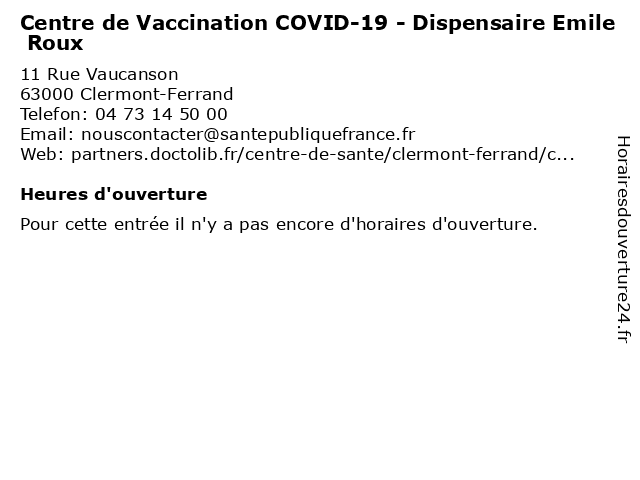 1 Dispensaire Emile Roux - Pneumologie (secrétariat ) (Distance: 0,03 km) 11 rue Vaucanson, 63100 Clermont Ferrand consultation, dispensaire, docteur, emile, pneumologie, roux, santé, secrétariat 2 Dr Dominique Roux - Chirurgien-dentiste (Distance: 0,24 km) 1 place Lucie et Raymond Aubrac, 63000 Clermont-Ferrand chirurgien, consultation, dentiste, docteur, dominique, dr, med, medecine, medical, médecin, roux, traitement 3 Centre de Vaccination COVID-19 - Maison des Sports (Distance: 1,71 km) - Place des Bughes, 63000 Clermont-Ferrand 19, centre, covid, covid 19, covid19, de, des, maison, médecin, médecine, médical, sports, test, vaccin, vaccination, vaccins 4 Coworking Local 19 (Distance: 1,72 km) 33 Rue Pascal, 63000 Clermont-Ferrand 19, clermont-ferrand, coworking, espace, le local, local, travail 5 Roux Poissonnier Sarl (Distance: 2,11 km) 2 Marche Saint Pierre, 63000 Clermont Ferrand boucheries, poissonneries, poissonnier, roux 6 Lamoine Jean-Hugues Luc Emile Rene (Distance: 2,82 km) Appartement c 104, 63000 Clermont Ferrand emile, hugues, jean, lamoine, luc, rene, restaurants |