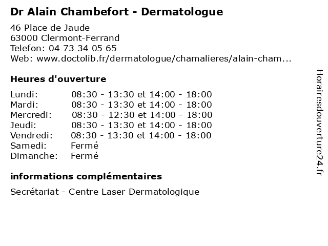 1 Dr Benoît Biard - Dermatologue - secrétariat (Distance: 0,06 km) 3 Avenue Julien, 63000 Clermont-Ferrand benoît, biard, consultation, dermatologue, docteur, dr, med, médecin, médecine, secrétariat, traitement 2 Dr Catherine Motreff - Dermatologue - secrétariat (Distance: 0,06 km) 3 Avenue Julien, 63000 Clermont-Ferrand catherine, consultation, dermatologue, docteur, dr, med, motreff, médecin, médecine, secrétariat, traitement 3 Alain Zito - Hypnothérapeute (Distance: 0,15 km) 9 Place de Jaude, 63000 Clermont-Ferrand alain, hypno, hypnose, hypnothérapeute, sante, zito 4 Dr Alain Benatouil - Psychiatre (Distance: 0,38 km) 18 bis Rue Rameau, 63000 Clermont-Ferrand alain, benatouil, dr, psy, psychiatre, sante, soins 5 Dr Alain Chambefort - Dermatologue et vénérologue (Distance: 0,70 km) 21 Boulevard Berthelot, 63400 Chamalières aain, alain, chambefort, consultation, dermatologie, dermatologue, docteur, dr, dr., et, medecins, rendez, santé, sur, vous, vénérologie, vénérologue 6 Goutte Fangeas Alain (Distance: 1,16 km) 60 b Avenue De La Liberation, 63000 Clermont Ferrand alain, boucheries, fangeas, goutte, poissonneries |