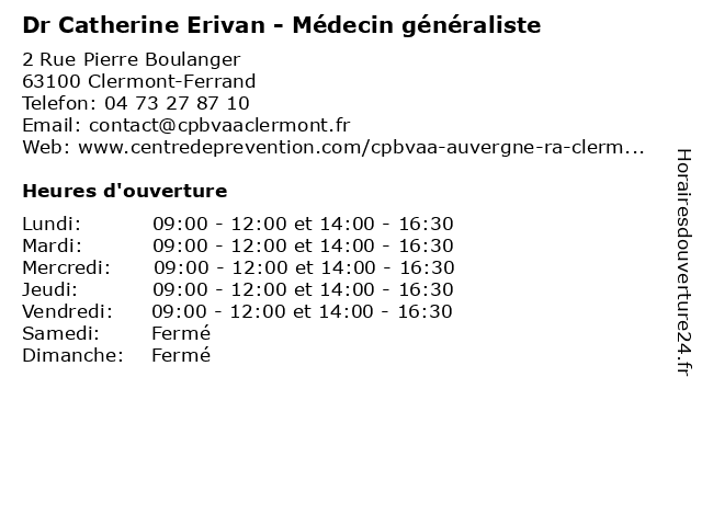 1 Dr Catherine Perruche - Médecin du travail (Distance: 1,25 km) 1 rue des Frères Lumière, 63000 Clermont-Ferrand catherine, consultation, docteur, dr, du, med, médecin, perruche, traitement, travail 2 Maître Catherine Roggerini-Thevenet - Avocate (Distance: 2,29 km) 56 Boulevard Gustave Flaubert, 63000 Clermont-Ferrand avocate, avocats, catherine, civils, droits, juridiques, maître, roggerini, thevenet 3 Catherine Foulhy - Sage-femme (Distance: 2,43 km) 1 place Lucie et Raymond Aubrac, 63000 Clermont-Ferrand catherine, consultation, docteur, dr, femme, foulhy, med, médecin, sage, traitement 4 Dr Catherine Sarret - Pédiatre (Distance: 2,43 km) 1 place Lucie et Raymond Aubrac, 63000 Clermont-Ferrand catherine, consultation, docteur, dr, med, medecine, medical, médecin, pédiatre, sarret, traitement 5 Dufour Catherine (Distance: 4,42 km) 10 b Rue Des Chaussetiers, 63000 Clermont Ferrand catherine, dufour, restaurants 6 Dr Roger Erivan - Chirurgien orthopédiste (Distance: 4,57 km) 58 Rue Montalembert, 63000 Clermont-Ferrand chirurgien, consultation, docteur, dr, erivan, genou, greffe, hanche, ligament, med, médecin, orthopédiste, prothèse, roger, traitement |