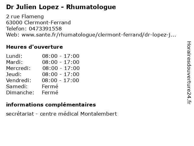 1 Dr Julien Lopez - Rhumatologue (Distance: 4,87 km) 46 Rue de Sarliève, 63800 Cournon-d'Auvergne docteur, dr, julien, lopez, rhumatologue, rhume, soin 2 Dr Valérie Beaugendre - Rhumatologue (Distance: 0,01 km) 2 Rue Flameng, 63000 Clermont-Ferrand beaugendre, dr, rhumatisme, rhumatologue, sante, soins, valerie, valérie 3 Dr Christine Voquer - Rhumatologue (Distance: 0,01 km) 2 Rue Flameng, 63000 Clermont-Ferrand christine, dr, rhumatisme, rhumatologue, sante, soins, voquer 4 Dr Sophie Kheng - Rhumatologue (Distance: 0,01 km) 2 Rue Flameng, 63000 Clermont-Ferrand dr, kheng, rhumatisme, rhumatologue, sante, soins, sophie 5 Dr Julien Brehant - Radiologue (Distance: 0,32 km) 58 rue Montalembert, 63011 Clermont-Ferrand brehant, consultation, docteur, dr, julien, med, médecin, médecine, radiologue, traitement 6 Dr Vincent Lopez - Médecin du travail (Distance: 0,40 km) 58 Rue Montalembert, 63000 Clermont-Ferrand consultation, docteur, dr, du, lopez, med, médecin, traitement, travail, vincent |