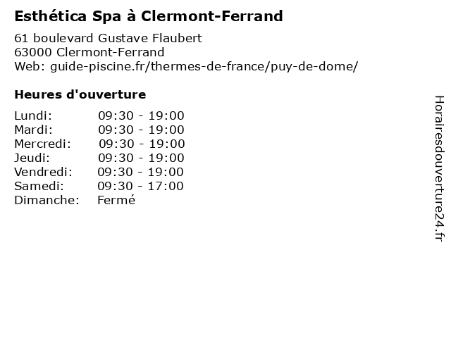1 Spa La Vie en Bio à Aubière (Distance: 1,94 km) 1 avenue de Cournon, 63170 Aubière aubière, bio, en, la, natation sportive, piscine, spa, sportif, vie 3 Essentiel Piscine Essentiel Spa - Hydro Sud Clermont-Ferrand (Distance: 3,42 km) 1 Rue Saint-Exupéry, 63800 Cournon-d'Auvergne clermont, essentiel, ferrand, hydro, piscine, spa, sud 4 Daya Day Spa (Distance: 3,78 km) 74 Rue Saint-Alyre, 63000 Clermont Ferrand bien-etre, day, daya, institut, modelage, soins, spa 6 Spa du Centre Royatonic à Royat - Les bains (Distance: 5,31 km) 5 avenue Auguste Rouzaud, 63130 Royat bains, centre, du, les, natation sportive, piscine, royat, royatonic, spa, sportif |