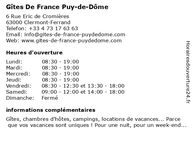 | Vendredi | 08:30-12:30 et 13:30-18:00 |