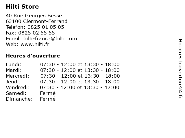 1 Hilti Store (service clients) (Distance: 0,00 km) 40 Rue Georges Besse, 63100 Clermont-Ferrand clients, equipements, hilti, machinerie, service, store 2 Ceramic Store (Distance: 0,74 km) 9 rue Louis Blériot, 63100 Clermont Ferrand ceramic, de dallages, store, vente de carrelages 3 Taklope Store (Distance: 3,19 km) 8 Rue Ernest Cristal, 63000 Clermont-Ferrand cigarette, magasins, store, taklope, électronique 4 Monsieur Store (Distance: 3,32 km) 86 avenue Ernest Cristal, 63172 Aubiere fenetres, monsieur, pergolas, portails, portes, portes de garage, store, volets 6 K Candy Store (Distance: 4,57 km) 11 b Rue Saint Esprit, 63000 Clermont Ferrand boulangeries, candy, détail, store |