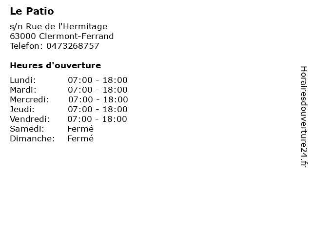 1 Le patio des carmes (Distance: 3,37 km) 4 bis Place des Carmes Dechaux, 63000 Clermont-Ferrand carmes, des, le, patio 2 Le patio des carmes (Distance: 3,37 km) 4 bis Place des Carmes Dechaux, 63000 Clermont-Ferrand carmes, des, le, patio 3 Le patio des carmes (Distance: 3,37 km) 4 bis Place des Carmes Dechaux, 63000 Clermont-Ferrand carmes, des, le, patio 4 Le Patio Nata (Distance: 3,80 km) 28 rue des Petits Gras, 63000 Clermont-Ferrand fast, food, francais, le, nata, patio, restaurant, viandes 5 Hotel-Restaurant Le Patio (Distance: 46,07 km) 8 Rue de Paris, 03200 Vichy hotel, le, patio, restaurant 6 O’Tacos (Distance: 0,39 km) 157 Boulevard Gustave Flaubert, 63000 Clermont-Ferrand boissons, nourriture, o’tacos, restaurant, service |