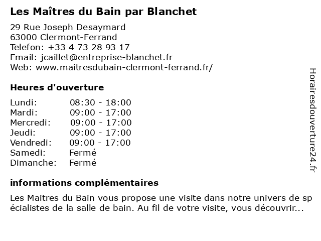 1 Blanchet Plomberie Chauffage (Distance: 0,05 km) 46 Rue Joseph Desaymard, 63000 Clermont-Ferrand blanchet, chauffage, plomberie 2 Les Maîtres du Bain (Distance: 0,05 km) 46 rue Joseph Desaymard, 63000 Clermont-Ferrand bain, clermont, du, ferrand, installation salle de bain, les, maitres, maîtres, renovation salle de bain, salle de bain, salle de bain clermont-ferrand 3 Emilie Blanchet - Sage-femme (Distance: 2,50 km) 1 place Lucie et Raymond Aubrac, 63000 Clermont-Ferrand blanchet, consultation, docteur, dr, emilie, femme, med, médecin, sage, traitement 4 L'Homme Vu par Charlotte (Distance: 3,59 km) 20 rue Saint-Esprit, 63000 Clermont-Ferrand barbier, charlotte, coiffure, coupe, homme, l'homme, par, rasage, vu 5 L'univers du Rasage par Gentleman Barbier (Distance: 3,88 km) 40 Rue des Gras, 63300 Clermont-Ferrand barbier, coiffure, du, gentleman, l'univers, lame, magasin, matériel, par, rasage, rasoirs 6 Optic par Prévifrance CLERMONT-FERRAND (Distance: 4,03 km) 16 Place Gilbert Gaillard, 63038 Clermont-Ferrand clermont, ferrand, optic, par, prévifrance |