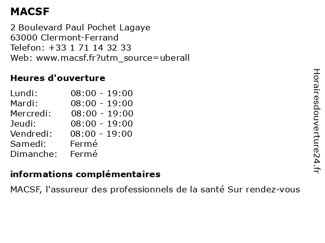 1 MACSF (Distance: 0,00 km)2 Boulevard Paul Pochet Lagaye, 63000 Clermont-Ferrand macsf
