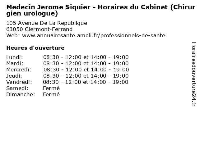 Termes de recherche pour Medecin Jerome Siquier - Horaires du Cabinet (Chirurgien urologue):du, horaires, cabinet, services, santé, jérôme, docteur, médecin, chirurgien, siquier, urologue |