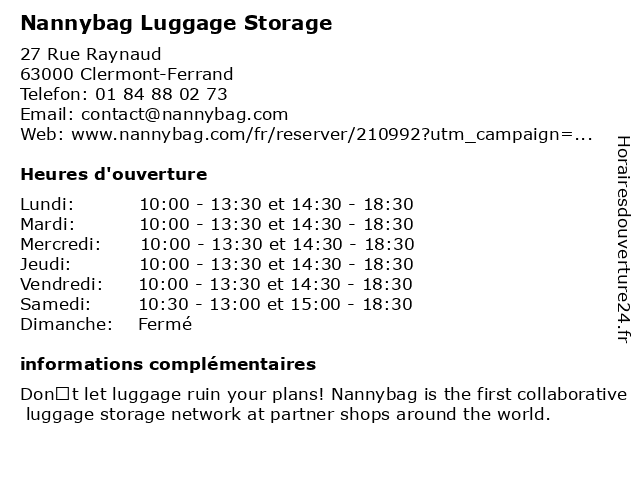 1 Nannybag Luggage Storage (Distance: 0,47 km) 6 Av. Vercingétorix, 63000 Clermont-Ferrand luggage, nannybag, storage 2 Nannybag Luggage Storage (Distance: 1,03 km) 41 Bd Trudaine, 63000 Clermont-Ferrand luggage, nannybag, storage 3 Nannybag Luggage Storage (Distance: 1,16 km) 9 Av. Albert Et Élisabeth, 63000 Clermont-Ferrand luggage, nannybag, storage 4 Nannybag Luggage Storage (Distance: 1,19 km) 28 Rue Du Port, 63000 Clermont-Ferrand luggage, nannybag, storage 5 Nannybag Luggage Storage (Distance: 1,26 km) 5 Rue Du 11 Novembre, 63000 Clermont-Ferrand luggage, nannybag, storage 6 Nannybag Luggage Storage (Distance: 1,37 km) 6 Rue Sainte-rose, 63000 Clermont-Ferrand luggage, nannybag, storage |