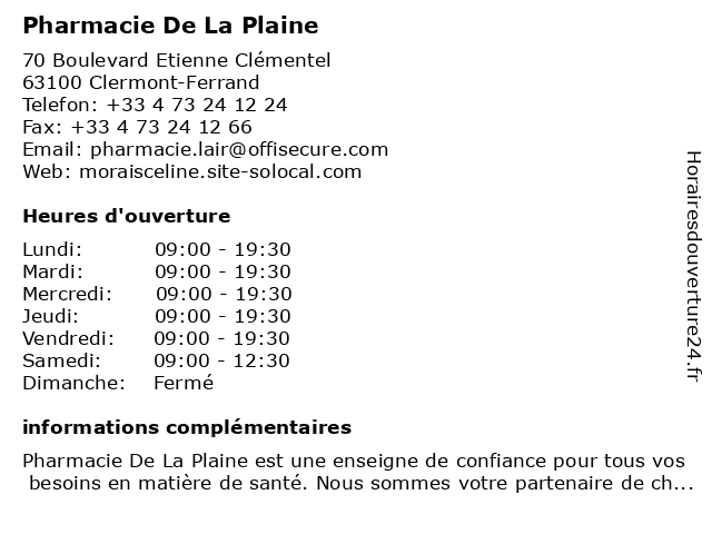 1 TotalEnergies - RELAIS DE LA PLAINE (Distance: 0,47 km) 108 BLD ETIENNE CLEMENTEL, 63000 CLERMONT FERRAND de, gas station, la, plaine, relais, station service, tankstelle, total, totalenergies 2 AEP La Plaine (Distance: 1,40 km) 49 Rue de Tournoel, 63100 Clermont-Ferrand aep, clermont, clermont-ferrand, de, domicile, ferrand, la, la plaine, livraison, plaine, portage, repas 3 Communauté de communes - Plaine Limagne (Distance: 25,44 km) 158 Grande rue, 63260 Aigueperse administration, communauté, communes, de, d’information, limagne, plaine, publics, services 4 Pharmacie Du Coq (Distance: 0,35 km) . Boulevard Etienne Clémentel, 63100 Clermont Ferrand conseils, coq, du, homéopathie, médicaments, orthopédie, parapharmacie, pharmacie 5 Pharmacie Leyrat Fiocre (Distance: 0,81 km) 7 Rue de l'Aiguillade, 63100 Clermont-Ferrand fiocre, leyrat, pharmacie 6 Pharmacie Du Sirocco (Distance: 0,83 km) . Boulevard Etienne Clémentel, 63100 Clermont Ferrand beaute, boutiques, chaussures, deco, du, enfants, mode femme, mode hommes, pharmacie, restaurant, sirocco, sport  |