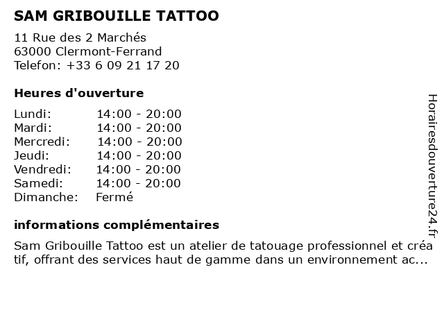 1 Maneil Tattoo (Distance: 0,28 km) 15 Rue du port, 63000 Clermont-Ferrand dessin, maneil, piercing, tatouages, tattoo 2 Santa Sangre / Tattoo (Distance: 0,31 km) 9 Rue Massillon, 63000 Clermont-Ferrand sangre, santa, tattoo 3 Add' Ink Tattoo (Distance: 0,64 km) 53 Rue Blatin, 63000 Clermont-ferand add', art shop, beauty, body ink, business, ink, skin, tattoo 4 KNS TATTOO SHOP (Distance: 1,14 km) 24 Avenue Edouard Michelin, 63000 Clermont-Ferrand kns, shop, tattoo, tattoo artist, tattoo shop, tattoos 5 KNS Tattoo Shop (Distance: 1,14 km) 24 Avenue Edouard Michelin, 63100 Clermont-Ferrand dessin, kns, piercing, shop, tatouages, tattoo 6 Eternal Tattoo (Distance: 1,29 km) 21 Rue du Pré l'Abbé, 63400 Chamalières art shop, beauty, body ink, business, eternal, skin, tattoo |