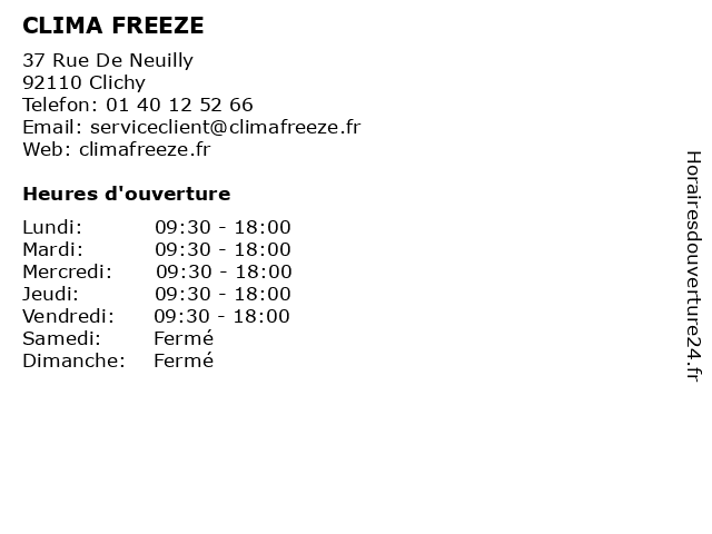 2 Clima-Genie SAS (Distance: 31,78 km) 10 Allée des Champs Elysées, 91080 Évry-Courcouronnes clima, genie, sas 3 Azur Clima Therm (Distance: 39,77 km) 26 Rue de Cordon et de Meillant, 77111 Soignolles-en-Brie azur, clima, therm |