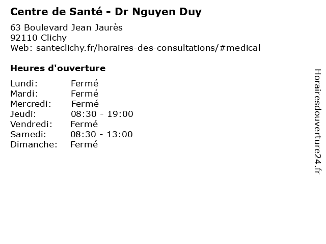 1 Dr Stéphanie Nguyen-Duy - Médecin généraliste (Distance: 0,00 km) 63 Boulevard Jean Jaurès, 92110 Clichy dr, duy, généraliste, médecin, médecine, médical, nguyen, pharmaceutique, stéphanie, traitement 2 Dr Stéphanie Nguyen-Duy - Médecin généraliste (Distance: 0,00 km) 63 Boulevard Jean Jaurès, 92110 Clichy dr, duy, généraliste, médecin, médecins, médicaments, nguyen, santé, secrétariat, spécialiste, stéphanie 3 Centre de Santé - Dr Gautreau (Distance: 0,00 km) 63 Boulevard Jean Jaurès, 92110 Clichy bureau, centre, consultation, de, dr, gautreau, maladie, med, médecin, médecine, pratique, santé, thérapie, traitement 4 Centre de Santé - Dr Tavares (Distance: 0,00 km) 63 Boulevard Jean Jaurès, 92110 Clichy bureau, centre, consultation, de, dr, maladie, med, médecin, médecine, pratique, santé, tavares, thérapie, traitement 5 Centre de Santé - Dr Sultan (Distance: 0,00 km) 63 Boulevard Jean Jaurès, 92110 Clichy bureau, centre, consultation, de, dr, maladie, med, médecin, médecine, pratique, santé, sultan, thérapie, traitement 6 Centre de Santé - Dr Zana Cohen (Distance: 0,00 km) 63 Boulevard Jean Jaurès, 92110 Clichy bureau, centre, cohen, consultation, de, dr, maladie, med, médecin, médecine, pratique, santé, thérapie, traitement, zana |