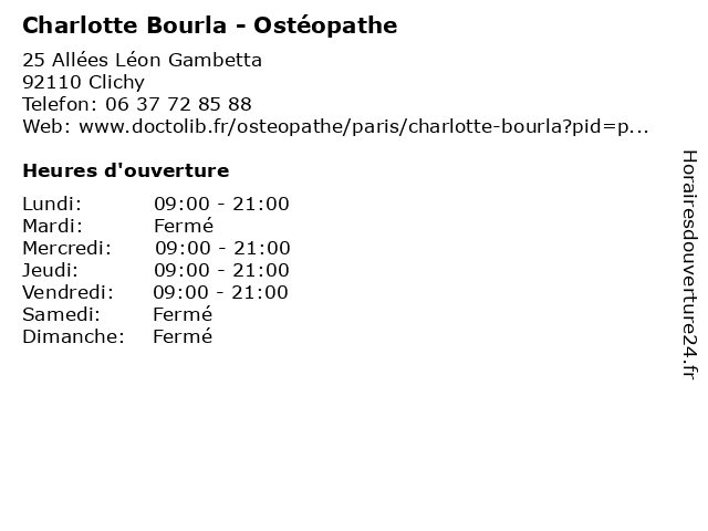1 Charlotte Bourla - Ostéopathe (Distance: 8,50 km) 4 Rue du Loing, 75014 Paris bourla, charlotte, ostéo, ostéopathe, ostéopathes, soins 2 Dr Charlotte Fernet - Gériatre (Distance: 0,62 km) 100 Boulevard du Général Leclerc, 92118 Clichy charlotte, consultation, docteur, dr, fernet, gériatre, med, medecine, medical, médecin, traitement 3 Maître Charlotte Pineau - Avocate (Distance: 1,88 km) 75 rue de Tocqueville, 75017 Paris avocate, avocats, cabinet, charlotte, conseils, contentieux, juridique, justice, litiges, maître, pineau, services 4 Maître Charlotte Hershkovitch - Avocate (Distance: 1,88 km) 75 rue de Tocqueville, 75017 Paris avocate, avocats, cabinet, charlotte, conseils, contentieux, hershkovitch, juridique, justice, litiges, maître, services 5 Anne-Charlotte Delobelle - Diététicien (Distance: 1,89 km) 8 Rue Gustave Doré, 75017 Paris anne, cabinet, charlotte, delobelle, diététicien, diététique, medical, secrétariat 6 Dr Anne-Charlotte Poulain - Gynécologue médical (Distance: 1,97 km) 80 Avenue Chandon, 92230 Gennevilliers anne, charlotte, consultation, docteur, dr, gynécologue, med, médecin, médecine, médical, poulain, traitement |