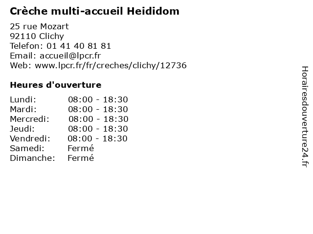 1 Multi-accueil La Flûte Enchantée (Distance: 0,12 km) 22bis Rue Georges Boisseau, 92110 Clichy accueil, creche, enchantée, enfant, flûte, garderie, la, multi, éveil 2 Crèche multi-accueil Les Petits Chaperons Rouges - Clichy Vega (Distance: 0,29 km) 6 Allée Jean Prouvé, 92110 Clichy accueil, chaperons, clichy, creche, crèche, enfant, garderie, les, multi, petits, rouges, vega, éveil 3 Centre d'information et D'Orientation (Accueil ouvert pendant) (Distance: 0,71 km) 39 Rue Pierre-Rebière, 75017 Paris accueil, administration, assoc, centre, d'information, d'orientation, et, ouvert, pendant, services, services publics 4 Micro-Crèche Möm (Distance: 0,75 km) 30 Rue Villeneuve, 92110 Clichy and, baby, clichy, crèche, crèches, garde d'enfants, les services parentalité, micro, möm, people, projet social, projet éducatif 6 Serrurerie Escale Multi Services (Distance: 1,08 km) 70 Rue de La Jonquière, 75017 Paris escale, multi, serrurerie, services |