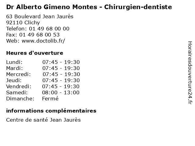 1 Dr Alberto Gimeno Montes - Chirurgien-dentiste (Distance: 3,76 km) 8 Avenue du Luth, 92230 Gennevilliers alberto, centre, chirurgien, dentaire, dentiste, dr, du, gennevilliers, gimeno, implantologie, luth, montes, médico, parodontologie 2 Dr Alberto Gabai - Chirurgien-dentiste (Distance: 0,49 km) 108 Rue Martre, 92110 Clichy alberto, chirurgien, dentaire, dentiste, dr, gabai, implantologie, parodontologie 3 Le Bistro d'Alberto (Distance: 2,12 km) 150 Boulevard Pereire, 75017 Paris 150, bistro, bistrot, d'alberto, le, nourriture, restaurants 4 Dr Alberto Galego - Chirurgien-dentiste (Distance: 2,40 km) 132 Avenue Gabriel Péri, 93400 Saint-Ouen alberto, chirurgien, consultation, dentiste, docteur, dr, galego, med, médecin, traitement 5 Maître Alberto Corduas - Avocat (Distance: 2,67 km) 9 avenue Hoche, 75008 Paris alberto, avocat, avocats, cabinet, conseils, contentieux, corduas, juridique, justice, litiges, maître, services 6 Dr Alberto Bossi - Onco-radiothérapeute (Distance: 4,68 km) 65 Avenue Foch, 92250 La Garenne-Colombes alberto, bossi, consultation, docteur, dr, med, médecin, onco, radiothérapeute, traitement |