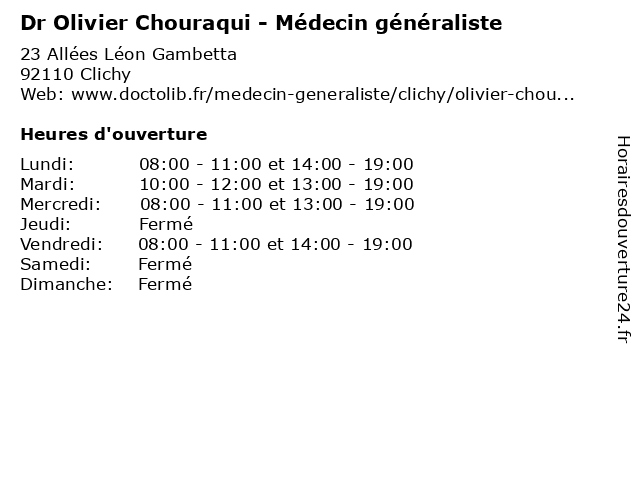 | Lundi | 08:00-11:00 et 14:00-19:00 |