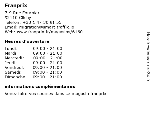 1 Franprix (Distance: 0,42 km) 13 Rue d'Estienne d'Orves, 92110 Clichy bibi, carte de fidélité, courses, franprix, magasin, produits frais, programme de fidélité, supermarché, épicerie 2 Franprix (Distance: 0,45 km) 69 rue de Neuilly, 92110 CLICHY alimentation générale, entretien de la maison et de l'hygiène, franprix, franprix magasin, fruits et légumes frais 3 Franprix (Distance: 0,77 km) 15 Rue Henri Barbusse, 92110 Clichy bibi, carte de fidélité, courses, franprix, magasin, produits frais, programme de fidélité, supermarché, épicerie 4 Franprix (Distance: 0,83 km) 32 Rue Palloy, 92110 Clichy bibi, carte de fidélité, courses, franprix, magasin, produits frais, programme de fidélité, supermarché, épicerie 5 Franprix (Distance: 1,09 km) 65 av.de la Marne, 92600 ASNIÈRES SUR SEINE alimentation générale, entretien de la maison et de l'hygiène, franprix, franprix magasin, fruits et légumes frais 6 Franprix (Distance: 1,11 km) 49 Rue Victor Hugo, 92300 Levallois-Perret alimentation, epicerie, franprix, supermarché |