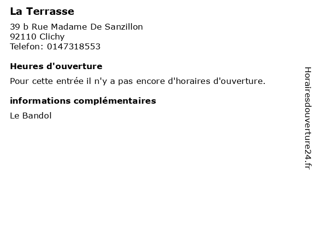 2 La Terrasse (Distance: 5,99 km) 20 Boulevard Charles De Gaulle, 92700 Colombes restaurants, semache, terrasse 4 La Terrasse (Distance: 8,87 km) 47 Avenue De Stalingrad, 93170 Bagnolet melodie, restaurants, terrasse 5 La Terrasse (Distance: 8,94 km) 16 Rue Edouard Vaillant, 93170 Bagnolet boukhechba, restaurants, saber, terrasse 6 La Terrasse (Distance: 9,21 km) Centre Flanades r Toulouse, 95200 Sarcelles maya, restaurants, terrasse |