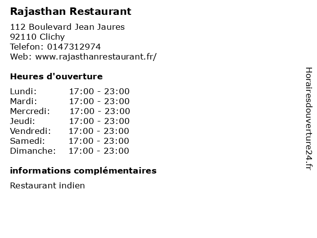 1 Royal Rajasthan (Distance: 6,05 km) 8 Rue Humblot, 75015 Paris rajasthan, renaissance, restaurants, royal, tajmahal 3 Rajasthan (Distance: 14,17 km) 11 Grande Rue, 92350 Le Plessis-Robinson bistrot, brasserie, café, rajasthan, restaurant, restauration 5 Brasserie Le 114 (Distance: 0,01 km) 114 Boulevard Jean Jaurès, 92110 Clichy 114, bar, brasserie, café, le, restaurant, traditionnel 6 Naan Food (Distance: 0,16 km) 15 Rue de l'Ancienne Mairie, 92110 Clichy bar, bistro, bistrot, brasserie, café, food, naan, pub, restaurant, restauration, resto |