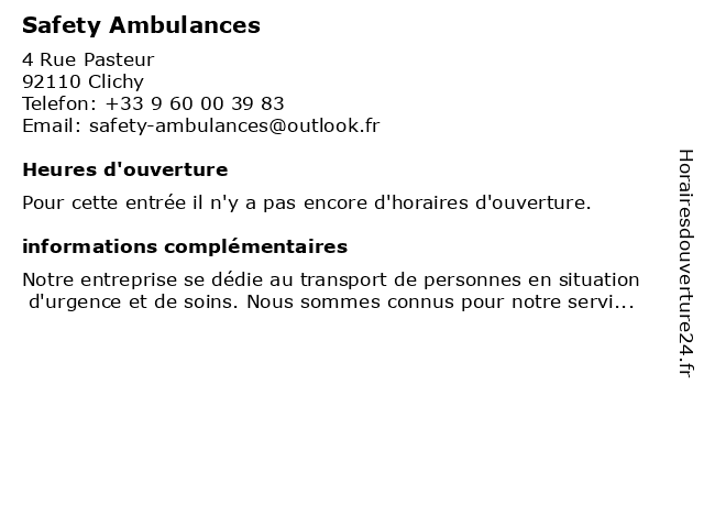 3 Colombes Ambulances (Distance: 4,33 km) 32 Rue Léon Maurice Nordmann, 92250 La Garenne-Colombes ambulances, colombes 4 Monceau Ambulances (Distance: 5,11 km) 6 Rue Valadon, 75007 Paris ambulances, monceau, services, transferts, urgences. santé 5 Ambulances Davout (Distance: 5,11 km) 6 Rue Valadon, 75007 Paris ambulances, davout, services, transferts, urgences. santé 6 Air Assistance Ambulances (Distance: 5,90 km) 102 Rue Henri Barbusse, 95100 Argenteuil air, ambulances, assistance |