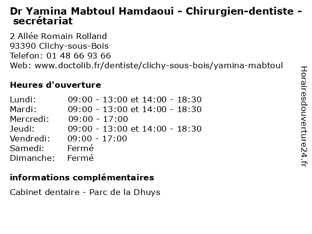 | Lundi | 09:00-13:00 et 14:00-18:30 |