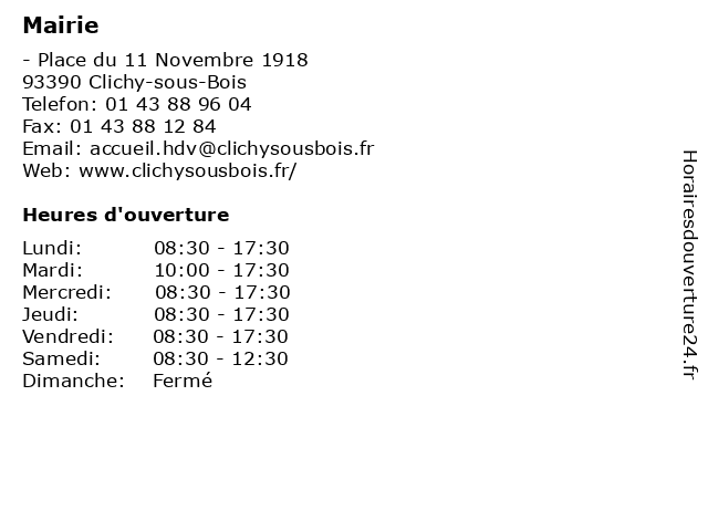 1 Mairie (Distance: 2,60 km) 121 Avenue de la Résistance, 93346 Le Raincy administration, mairie, public, service 2 Mairie (Distance: 3,43 km) - Route départementale 117, 09000 Celles administration, mairie, public, service 3 Mairie (Distance: 3,70 km) 144 Avenue Jean Jaurès, 93320 Les Pavillons-sous-Bois administration, mairie, public, service 4 Mairie (Distance: 4,87 km) - Esplanade Claude Fuzier, 93140 Bondy administration, mairie, public, service 5 Mairie (Distance: 8,62 km) 1 Grande Rue Charles-de-Gaulle, 94360 Bry-sur-Marne administration, mairie, public, service 6 Mairie (Distance: 11,73 km) Cariou 30 Avenue Corentin, 75019 Paris central, commune, gouvernement, mairie, nra, paris |