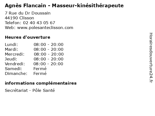 2 Dr Agnès Béreau - Pédiatre (Distance: 18,80 km) 143 Route de Nantes, 44120 Vertou agnès, béreau, dr, enfant, pediatre, pédiatre, sante, soins 4 Agnès Lamy - Ostéopathe (Distance: 21,28 km) 120 Rue Aristide Briand, 44400 Rezé agnes, agnès, lamy, ostéo, ostéopathe, ostéopathes, soins 6 Agnès Cailllaud - Sage-femme (Distance: 23,49 km) 38 boulevard Jean-Monnet, 44000 Nantes agnes, agnès, cailllaud, consultation, docteur, dr, femme, med, médecin, sage, traitement |