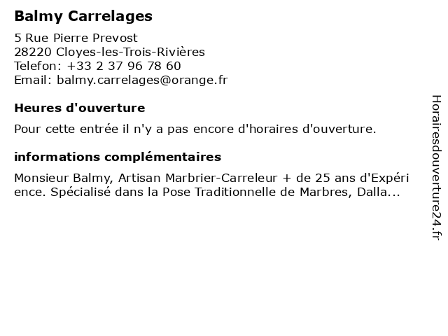 1 Costiles Carrelages (Distance: 11,53 km) 1 rue des Treize Langues, 28200 Châteaudun carrelage, carrelages, cher, costiles, exterieur, interieur, moins, pose, salle de bains 3 Point.P (Distance: 39,73 km) 49 route nationale 152, 45190 Tavers carrelages, matériaux, outillages, point.p, pointp 4 Mellier Carrelages (Distance: 40,17 km) - Route de Courgenard, Z.A, 72320 Lamnay carreaux, carrelage, carrelages, lamnay, mellier, pose 5 Ledoux Carrelage (Distance: 40,46 km) 5 Allée Gueslin, 28630 Mignières carrelage, carrelages, dallages, ledoux 6 Espace Aubade (Distance: 50,99 km) 32 Rue André Dessaux, 45400 Fleury-les-Aubrais aubade, carrelages, dallages, espace |
