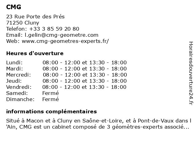 1 CMG - Géomètres-experts (Distance: 0,44 km) 23 Rue Porte des Prés, 71250 Cluny cluny, cmg, experts, geometres, géomètres 2 CMG - Géomètres-experts (Distance: 21,37 km) 40 Rue Maréchal de Lattre de Tassigny, 01190 Pont-de-Vaux cmg, experts, geometres, géomètres, pont-de-vaux |