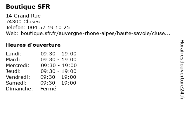 1 Boutique joelle dupont (Distance: 0,18 km) 3 rue pierre trappier, 74300 Cluses boutique, dupont, décoration, habitat, joelle 2 Espace SFR (Distance: 0,30 km) . Rue des Ponts, 54000 Nancy cafe, chaussures, enfants, espace, lingerie, mode femme, mode homme, restaurant, sfr 3 Boutique Orange - Cluses (Distance: 0,68 km) 42 Rue Claude Ballaloud, 74950 Scionzier boutique, cluses, orange 4 Cinelle Boutique - Chaussures et vêtements (Distance: 1,06 km) 72 avenue Georges Clemenceau, 74300 Cluses accessoires, boutique, chaussures, cinelle, et, mode, vetements, vêtements 5 Elle boutique (Distance: 1,47 km) 21 avenue de la liberation, 74300 Cluses accesoires, boutique, elle, mode 6 SFR Cluses (Distance: 1,63 km) 14 Grand Rue, 74300 Cluses cluses, compagnie de téléphone, magasin de téléphones mobiles, sfr, vente et installation du câble et du satellite |