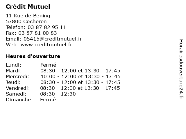 1 Crédit Mutuel (Distance: 0,16 km) 11 Rue De Bening, 57800 Cocheren compagnie de téléphone, crédit, mutuel, organisme d'assurance 2 Crédit Mutuel (Distance: 0,17 km) 11 Rue de bening, 57800 Cocheren compagnie de téléphone, crédit, mutuel, organisme d'assurance 3 Crédit Mutuel (Distance: 2,88 km) 14 Rue Eugène Kloster, 57800 Freyming-Merlebach agence, assurance, bancaire, banque, crédit, mutuel 4 Crédit Mutuel (Distance: 2,89 km) 14 Rue Eugene Kloster, 57800 Freyming Merlebach compagnie de téléphone, crédit, mutuel, organisme d'assurance 5 Crédit Mutuel (Distance: 3,02 km) - Place du Marché, 57450 Farebersviller agence, assurance, bancaire, banque, crédit, mutuel 6 Crédit Mutuel (Distance: 3,11 km) 48 Rue Principale, 57450 Theding agence, assurance, bancaire, banque, crédit, mutuel |