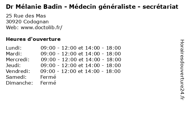 | Mercredi | 09:00-12:00 et 14:00-18:00 |