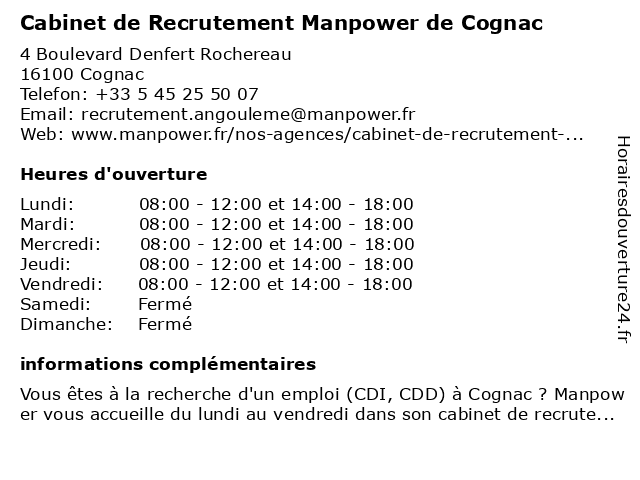 Termes de recherche pour Cabinet de Recrutement Manpower de Cognac:de, cognac, cabinet, interim, recrutement, manpower, cdi, agence de recrutement, agence intérim, agence pour l'emploi, cabinet de recrutement |