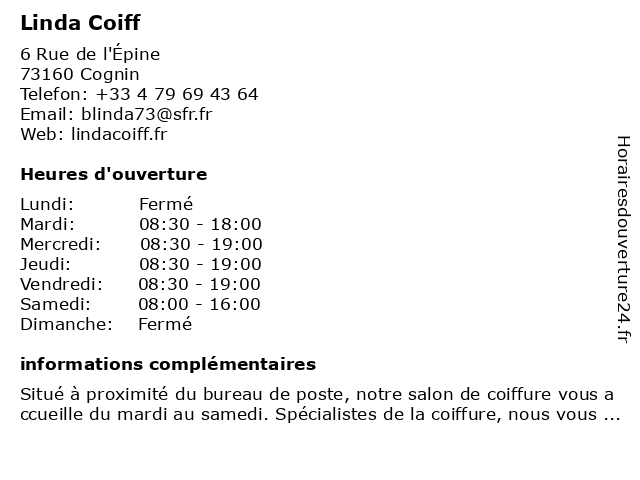 1 Ca Décoiffe Et Sam'Coiff (Distance: 3,19 km) 253 Rue Sainte-Rose, 73000 Chambéry ca, décoiffe, et, sam'coiff 2 Coiff Eclair (Distance: 3,45 km) 1097 Avenue des Landiers, 73000 Chambéry beaute, chaussures, coiff, deco, eclair, enfants, mode femmes, mode hommes, restaurant, sport 3 Coiff Mod (Distance: 3,45 km) 1097 Avenue des Landiers, 73000 Chambéry beaute, chaussures, coiff, deco, enfants, mod, mode femmes, mode hommes, restaurant, sport 4 Liberty's Coiff (Distance: 13,07 km) - Rue de l'Épinette, 38530 Chapareillan beauté, coiff, coiffeur, coiffure, coloration, coupe, liberty's, shampooing 5 Coiff' Line (Distance: 17,59 km) 16 place Carouge, 73330 Le Pont-de-Beauvoisin beauté, coiff', coiffeur, coiffure, coloration, coupe, line, shampooing 6 Dr Linda Dezissert - Médecin généraliste (Distance: 41,31 km) 13 Avenue du Tresum, 74000 Annecy consultation, dezissert, docteur, dr, généraliste, linda, med, médecin, médecine, secrétariat, traitement |