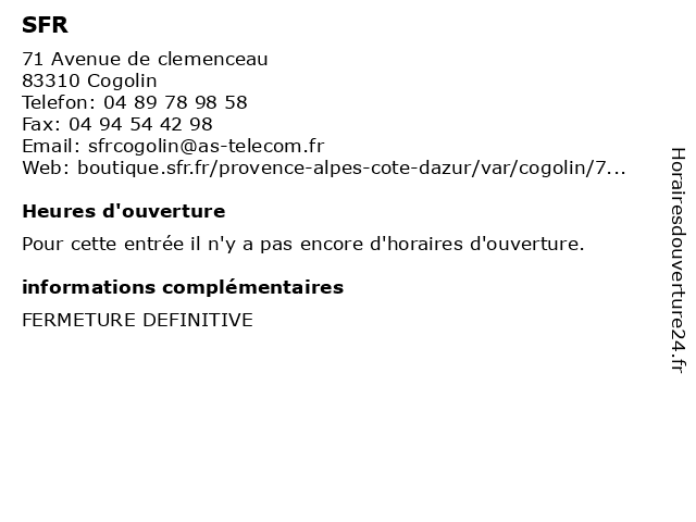 1 SFR (Distance: 0,15 km) 71 avenue Georges Clémenceau, 83310 Cogolin abonnements de téléphonie mobile ou fixe fixe ou carte prépayée, accès internet haut débit ou la fibre optique ainsi que des abonnements à des bouquets de chaînes de télévision ., sfr, téléphones mobiles 2 SFR (Distance: 3,48 km) - la Foux, 83580 Gassin abonnements de téléphonie mobile ou fixe fixe ou carte prépayée, accès internet haut débit ou la fibre optique ainsi que des abonnements à des bouquets de chaînes de télévision ., sfr, téléphones mobiles 3 SFR (Distance: 8,08 km) 19 Boulevard Louis Blanc, 83990 Saint Tropez abonnements de téléphonie mobile ou fixe fixe ou carte prépayée, accès internet haut débit ou la fibre optique ainsi que des abonnements à des bouquets de chaînes de télévision ., sfr, téléphones mobiles 4 SFR (Distance: 9,85 km) - Rue Jean Jaurès, 83120 Sainte-Maxime abonnements de téléphonie mobile ou fixe fixe ou carte prépayée, accès internet haut débit ou la fibre optique ainsi que des abonnements à des bouquets de chaînes de télévision ., sfr, téléphones mobiles 5 SFR (Distance: 18,75 km) 7 Avenue du Général de Gaulle, 83980 Lavandou abonnements de téléphonie mobile ou fixe fixe ou carte prépayée, accès internet haut débit ou la fibre optique ainsi que des abonnements à des bouquets de chaînes de télévision ., sfr, téléphones mobiles 6 Espace SFR (Distance: 3,46 km) 120 Rond-Point De La Foux, 83580 Gassin centre, commercial, espace, foux, galerie, geant, la, sfr |