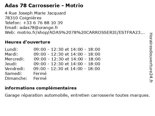 1 Adas 78 Carrosserie - Motrio (Distance: 0,00 km) 4 Rue Joseph Marie Jacquard, 78310 Coignières 78, adas, carrosserie, garage auto à proximité, garage automobile, garage coignières, garage motrio coignières, garage motrio à proximité, garage multimarque, garage à proximité, motrio, pneus motrio, promo motrio, rendez-vous garage 2 Adas 78 Carrosserie - Motrio (Distance: 0,00 km) 4 Rue Joseph Marie Jacquard, 78310 Coignières 78, adas, carrosserie, garage auto à proximité, garage automobile, garage coignières, garage motrio coignières, garage motrio à proximité, garage multimarque, garage à proximité, motrio, pneus motrio, promo motrio, rendez-vous garage 3 Adas 78 Carrosserie - Motrio (Distance: 0,00 km) 4 Rue Joseph Marie Jacquard, 78310 Coignières 78, adas, carrosserie, garage auto à proximité, garage automobile, garage coignières, garage motrio coignières, garage motrio à proximité, garage multimarque, garage à proximité, motrio, pneus motrio, promo motrio, rendez-vous garage 4 DAS 78 Maurepas - Bosch Car Service (Distance: 0,38 km) n/a rue Marie Curie, 78310 Maurepas 78, alternateurs, bosch, car, câbles d'allumage, das, démarreurs, essuie-glaces, filtres d'habitacle, filtres à air, les batteries, maurepas, service 5 Piscines Desjoyaux - Piscines 78 (Distance: 0,41 km) 151 RN 10, 78310 Coignières 78, de, desjoyaux, fitness, musculation, piscines, salle, sport 6 Sushi Wok 78 (Distance: 0,97 km) . Rond-point Laurent Schwartz, 78310 Maurepas 78, buffet, japonais, restaurant, sushi, wok |