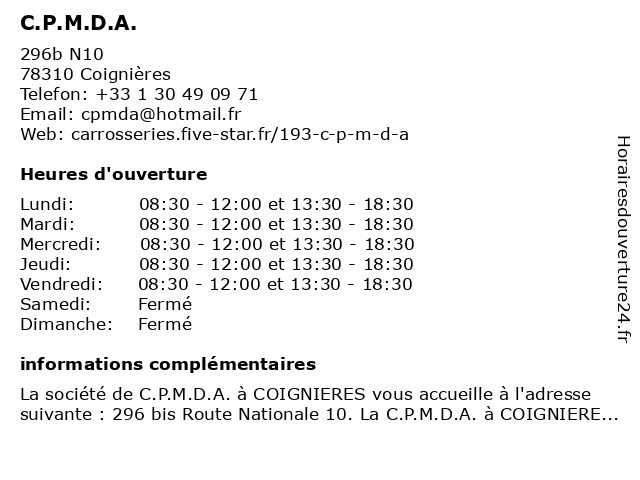 La société de C.P.M.D.A. à COIGNIERES vous accueille à l'adresse suivante : 296 bis Route Nationale 10. La C.P.M.D.A. à COIGNIERES fait partie du réseau Five Star. Ce réseau indépendant de ...