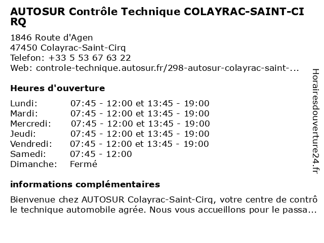4 AUTOSUR VALENCE D'AGEN (Distance: 28,62 km) 53 Avenue Jean Baylet, 82400 Valence d'Agen autosur, d'agen, valence 5 AUTOSUR Contrôle Technique FLEURANCE (Distance: 42,94 km) 2 Rue Jean Monties, 32500 Fleurance autosur, contrôle, fleurance, technique 6 AUTOSUR Contrôle Technique MOISSAC (Distance: 44,53 km) Route de l'Avenir, 82200 Moissac autosur, contrôle, moissac, technique |