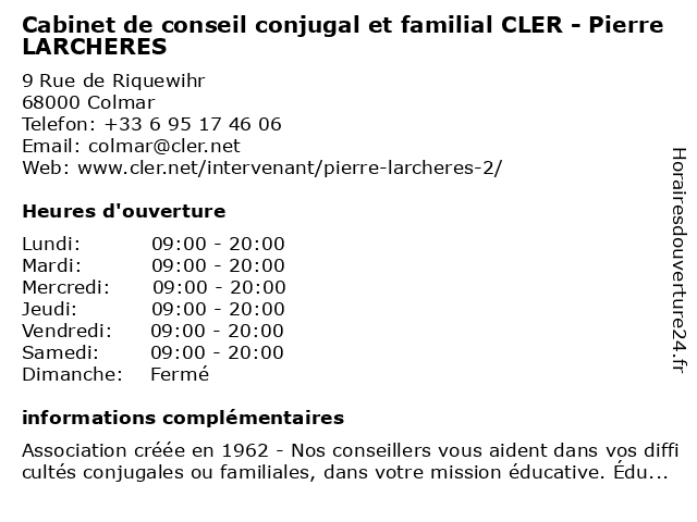 Termes de recherche pour Cabinet de conseil conjugal et familial CLER - Pierre LARCHERES:et, de, pierre, cabinet, conseil, familial, cler, larchères, conjugal |