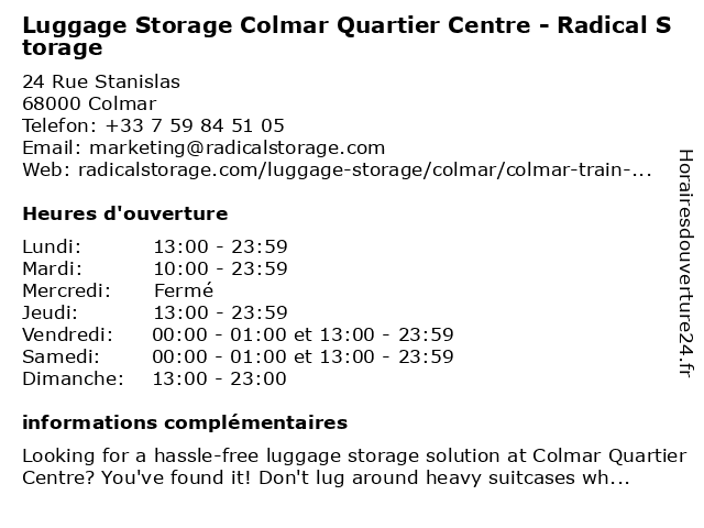 1 Luggage Storage Rue Stanislas - Radical Storage (Distance: 0,04 km) 18 Rue Stanislas, 68000 Colmar luggage, luggage storage, luggage storage near me, radical, rue, stanislas, storage 2 Nannybag Luggage Storage (Distance: 0,04 km) 18 Rue Stanislas, 68000 Colmar luggage, nannybag, storage 4 Nannybag Luggage Storage (Distance: 0,35 km) 7 Rte D'ingersheim, 68000 Colmar luggage, nannybag, storage 5 Luggage Storage Rte d'Ingesheim - Radical Storage (Distance: 0,35 km) 7 Route d'Ingersheim, 68000 Colmar d'ingesheim, luggage, luggage storage, luggage storage near me, radical, rte, storage 6 Nannybag Luggage Storage (Distance: 0,60 km) 12 Rue De L'ange, 68000 Colmar luggage, nannybag, storage |