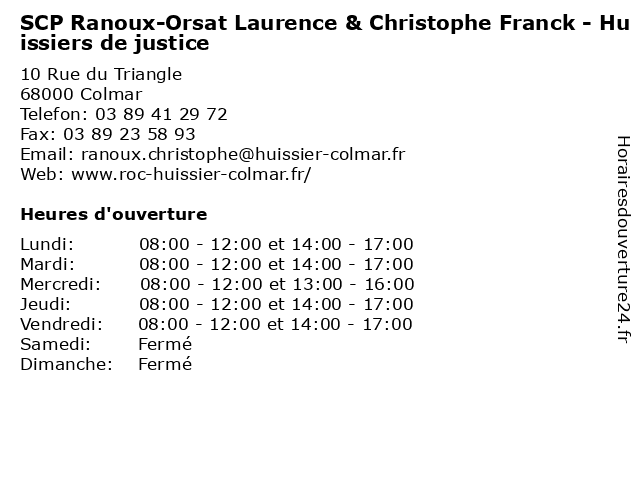1 Franck Provost (Distance: 0,07 km) 23A Rue Vauban, 68000 Colmar beauté, cheveux, coiffure, franck, provost, salon, service 2 Franck Ebstein (Distance: 0,36 km) 27 Rue Serruriers, 68000 Colmar ebstein, franck, magasin de linge de maison 3 Knittel Benoît - Nathalie Geismar-Wiss - Laurent Mattioni Notaires Associés SCP (Distance: 0,47 km) 5 Boulevard du Champ de Mars, 68000 Colmar associés, benoît, geismar, knittel, laurent, mattioni, nathalie, notaires, scp, wiss 4 Antoine-Guy Paulus et Marc Gerrer (scp) (Distance: 0,48 km) 22 rue Berthe Molly, 68000 Colmar antoine, avocat, conseil, droit, et, gerrer, guy, marc, paulus, scp 6 SCP de Pneumologie et d'Allergologie Respiratoire - Pneumologie (secrétariat ) (Distance: 0,75 km) 7 Avenue de la Marne, 68000 Colmar consultation, d'allergologie, de, docteur, et, pneumologie, respiratoire, santé, scp, secrétariat |