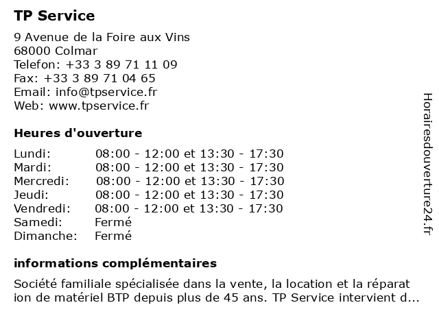 | Lundi | 08:00-12:00 et 13:30-17:30 |