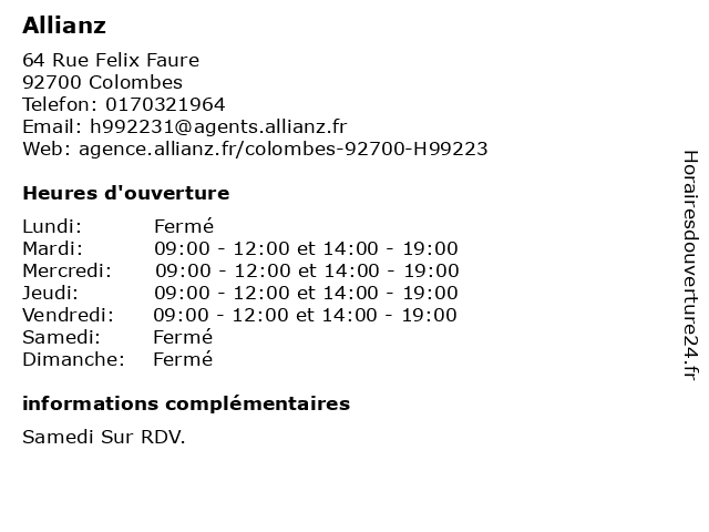 1 Allianz (Distance: 1,06 km) 11-17 Rue du Général Leclerc, 92270 Bois Colombes allianz, assurance prêt, assurances, services 2 Allianz (Distance: 2,59 km) 5 Place des Victoires, 92600 Asnieres Sur Seine allianz, assurance prêt, assurances, services 3 Allianz (Distance: 3,49 km) 92 avenue Achille Peretti, 92200 Neuilly Sur Seine agence, allianz, assurance, courtiers, vie 4 Allianz (Distance: 3,55 km) 80 Avenue Gabriel Peri, 95100 Argenteuil allianz, assurance prêt, assurances, services 5 Allianz (Distance: 3,65 km) 1 Rue Paul Vaillant Couturier, 95100 Argenteuil allianz, assurance prêt, assurances, services 6 |