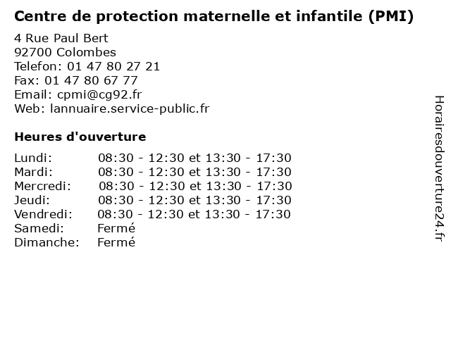 1 Centre de Protection Maternelle et Infantile (PMI) (Distance: 2,11 km) 267 Rue des Gros-Grès, 92700 Colombes administration, assoc, associations, aux, centre, d'information, de, des, dédié, et, greffe, infantile, information, local, locale, maternelle, mission, personnes, pmi, protection 2 Centre de Protection Maternelle et Infantile (PMI) (Distance: 2,12 km) 131 avenue Jean-Jaurès, 95100 Argenteuil administration, assoc, associations, aux, centre, d'information, de, des, dédié, et, greffe, infantile, information, local, locale, maternelle, mission, personnes, pmi, protection 3 Centre de Protection Maternelle et Infantile (PMI) (Distance: 2,18 km) 24 Rue des Mourinoux, 92600 Asnières-sur-Seine administration, assoc, associations, aux, centre, d'information, de, des, dédié, et, greffe, infantile, information, local, locale, maternelle, mission, personnes, pmi, protection 4 Centre de Protection Maternelle et Infantile (PMI) (Distance: 2,87 km) 104 Avenue d'Argenteuil, 92600 Asnières-sur-Seine administration, assoc, associations, aux, centre, d'information, de, des, dédié, et, greffe, infantile, information, local, locale, maternelle, mission, personnes, pmi, protection 5 Centre de protection maternelle et infantile (PMI) (Distance: 3,21 km) 21 Rue Julien Mocquard, 92230 Gennevilliers administration, assoc, associations, aux, centre, d'information, de, des, dédié, et, greffe, infantile, information, local, locale, maternelle, mission, personnes, pmi, protection 6 Centre de protection maternelle et infantile (PMI) (Distance: 3,28 km) 56 rue du Capitaine Guynemer, 92400 Courbevoie administration, assoc, associations, aux, centre, d'information, de, des, dédié, et, greffe, infantile, information, local, locale, maternelle, mission, personnes, pmi, protection |