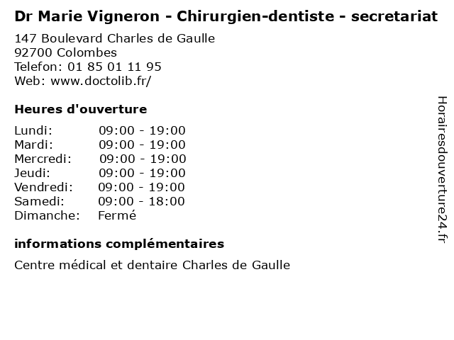 1 Dr Marie Vigneron - Chirurgien-dentiste - secrétariat (Distance: 0,00 km) 147 Boulevard Charles de Gaulle, 92700 Colombes chirurgien, consultation, dentiste, docteur, dr, marie, med, médecin, médecine, secrétariat, traitement, vigneron 2 Dr Nicole Vigneron - Médecin du travail (Distance: 8,14 km) 80 rue de Clichy, 75009 Paris consultation, docteur, dr, du, med, médecin, nicole, traitement, travail, vigneron 3 Dr Aurélie Vigneron - Chirurgien maxillo-facial et stomatologue (Distance: 8,26 km) 32 Rue Damrémont, 75018 Paris aurélie, chirurgie, chirurgien, dr, et, facial, general, maxillo, soins, stomatologue, vigneron 4 François Vigneron - Ostéopathe (Distance: 8,73 km) 81 Avenue Bosquet, 75007 Paris actes et symptômes, expertises, françois, ostéopathe, ostéopathie de la femme enceinte, ostéopathie pédiatrique, vigneron 5 Dr. Laurent Vigneron - Dentiste (Distance: 8,79 km) 139 Boulevard Jean Jaures, 92100 Boulogne-Billancourt dentiste, docteur, dr., laurent, medecins, sante, vigneron 6 Dr Marie Vigneron - Chirurgien-dentiste (Distance: 8,99 km) 76 Avenue Edouard Vaillant, 92100 Boulogne-Billancourt chirurgien, dentiste, dr, marie, médecin, médecine, médical, pharmaceutique, traitement, vigneron |