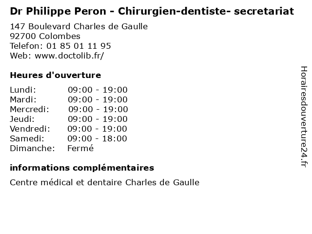 1 Dr Philippe Peron - Chirurgien-dentiste - secrétariat (Distance: 0,00 km) 147 Boulevard Charles de Gaulle, 92700 Colombes chirurgien, consultation, dentiste, docteur, dr, med, médecin, médecine, peron, philippe, secrétariat, traitement 2 Maître Alexandre Peron - Avocat (Distance: 3,39 km) 1-2 Place des Saisons, 92400 Courbevoie alexandre, avocat, avocate, avocats, civils, droits, juridiques, maître, peron 3 Deschamps Philippe (Distance: 8,45 km) 85 Rue des Rosiers, 93400 Saint-Ouen architecture, art forain, bijoux, céramiques, deschamps, mobilier, peintures & arts graphiques, philippe 4 Lachaux Philippe (Distance: 8,45 km) 85 Rue des Rosiers, 93400 Saint-Ouen architecture, art forain, bijoux, céramiques, lachaux, mobilier, peintures & arts graphiques, philippe 5 Maître Bastien Peron - Avocat (Distance: 9,21 km) 8 rue du Mont Thabor, 75001 Paris avocat, avocats, bastien, cabinet, conseils, contentieux, juridique, justice, litiges, maître, peron, services 6 Philippe Gosselin (Distance: 9,35 km) 258 boulevard Saint Germain, 75007 Paris boulangeries, cakes, gosselin, macarons, pains, patisserie, philippe |
