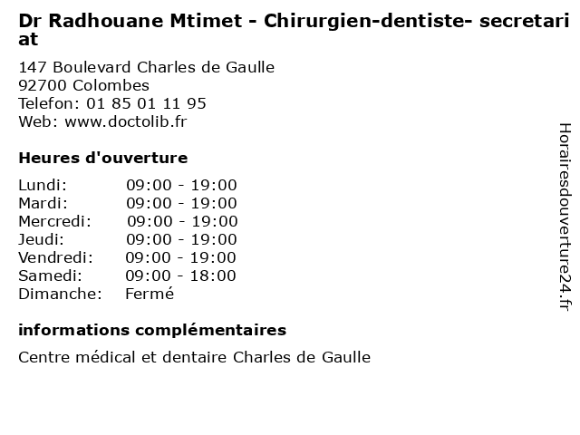 1 Dr Radhouane Mtimet - Chirurgien-dentiste - secrétariat (Distance: 0,00 km) 147 Boulevard Charles de Gaulle, 92700 Colombes chirurgien, consultation, dentiste, docteur, dr, med, mtimet, médecin, médecine, radhouane, secrétariat, traitement 2 Dr Radhouane Mtimet - Chirurgien-dentiste (Distance: 0,88 km) 147 Boulevard Charles de Gaulle, 92700 Colombes chirurgien, chirurgien-dentiste, dentiste, dr, mtimet, médecins, médicaments, radhouane, santé, secrétariat, spécialiste 3 Dr Evelyne Duparloir - Radiologue- secretariat (Distance: 1,29 km) 63 Avenue Foch, 92250 La Garenne-Colombes dr, duparloir, evelyne, médecin, médecine, médical, pharmaceutique, radiologue, secretariat, traitement 4 Dr F Hermant - Radiologue- secretariat (Distance: 1,29 km) 63 Avenue Foch, 92250 La Garenne-Colombes dr, hermant, médecin, médecine, médical, pharmaceutique, radiologue, secretariat, traitement 5 Dr C Hermant - Radiologue- secretariat (Distance: 1,29 km) 63 Avenue Foch, 92250 La Garenne-Colombes dr, hermant, médecin, médecine, médical, pharmaceutique, radiologue, secretariat, traitement 6 Dr Radhouane M'timet - Chirurgien-dentiste (Distance: 1,66 km) 468 Boulevard des Provinces Françaises, 92000 Nanterre chirurgie, chirurgien, dentaire, dentiste, dr, m'timet, radhouane |