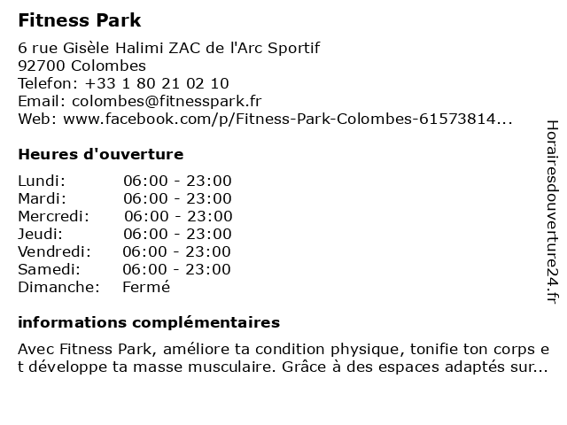 2 Fitness Park (Distance: 15,73 km) 4 Place de l'Europe, 94220 Charenton-le-Pont appareils, fitness, moniteurs, musculation, park 3 Ville d'Argenteuil - Car park (Distance: 0,50 km) - Place de Finlande Hauts-de-Seine, 92700 Colombes car, car parking, d'argenteuil, park, services, ville 4 SNCF - Car park (Distance: 0,50 km) - Place de Finlande, 92700 Colombes car, car parking, park, services, sncf 5 Mairie de Colombes - Car Park (Distance: 0,81 km) . Avenue Menelotte, 95100 Colombes automobile, car, colombes, de, mairie, park, parking, services 6 |